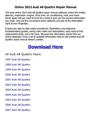 Presently you are looking with regard to an 2006 Audi A8 Quattro Service Repair Manual Software example of which we provide here in some kind of document formats like as PDF, Doc, Strength Point, as well as images of which will make it simpler for you to create an 2006 Audi A8 Quattro Service Repair Manual Software yourself. For a more clear look, you may open several examples below. Each of the good examples about 2006 Audi A8 Quattro Service Repair Manual Software with this website, we get from many sources so you can create a better record of your own.In case the search you obtain here does not match what you are looking for, please utilize the research feature that we have got provided here. You are free to download anything at all that we provide right here, expense cost you the particular slightest.